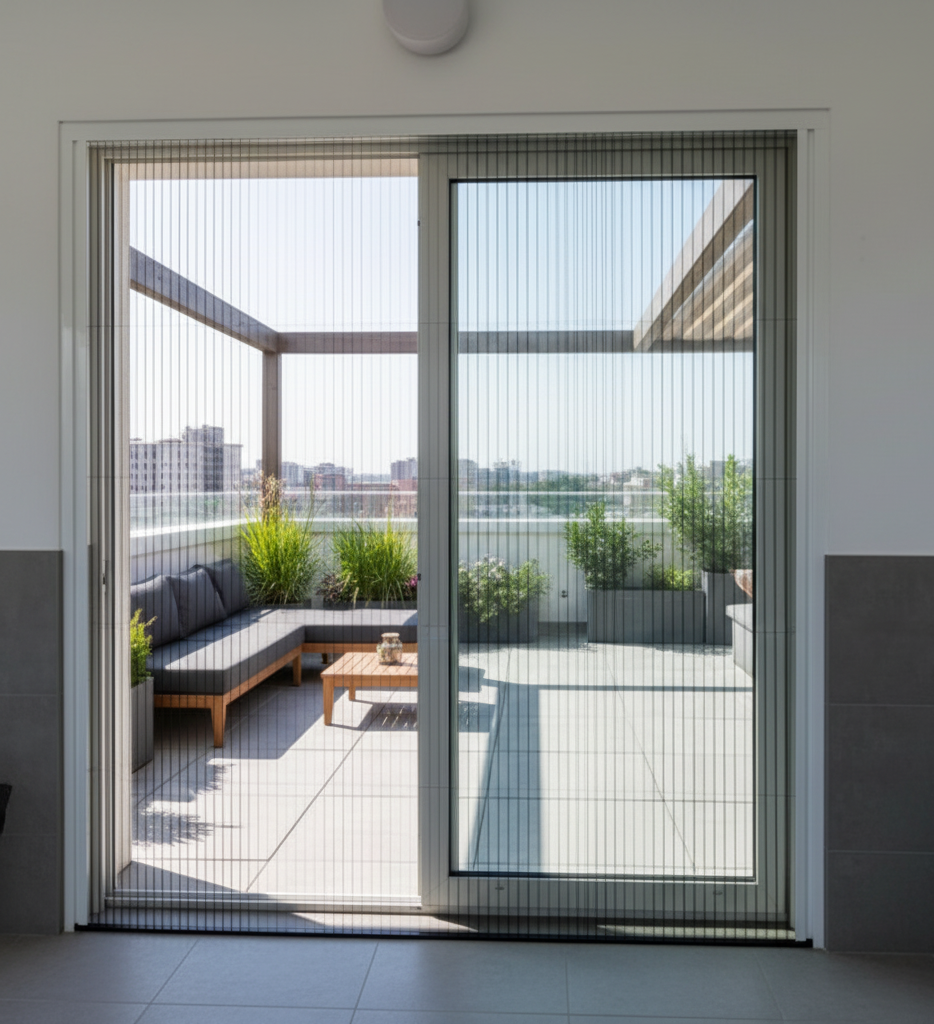 La mosquitera plisada se coloca en el exterior de la puerta.